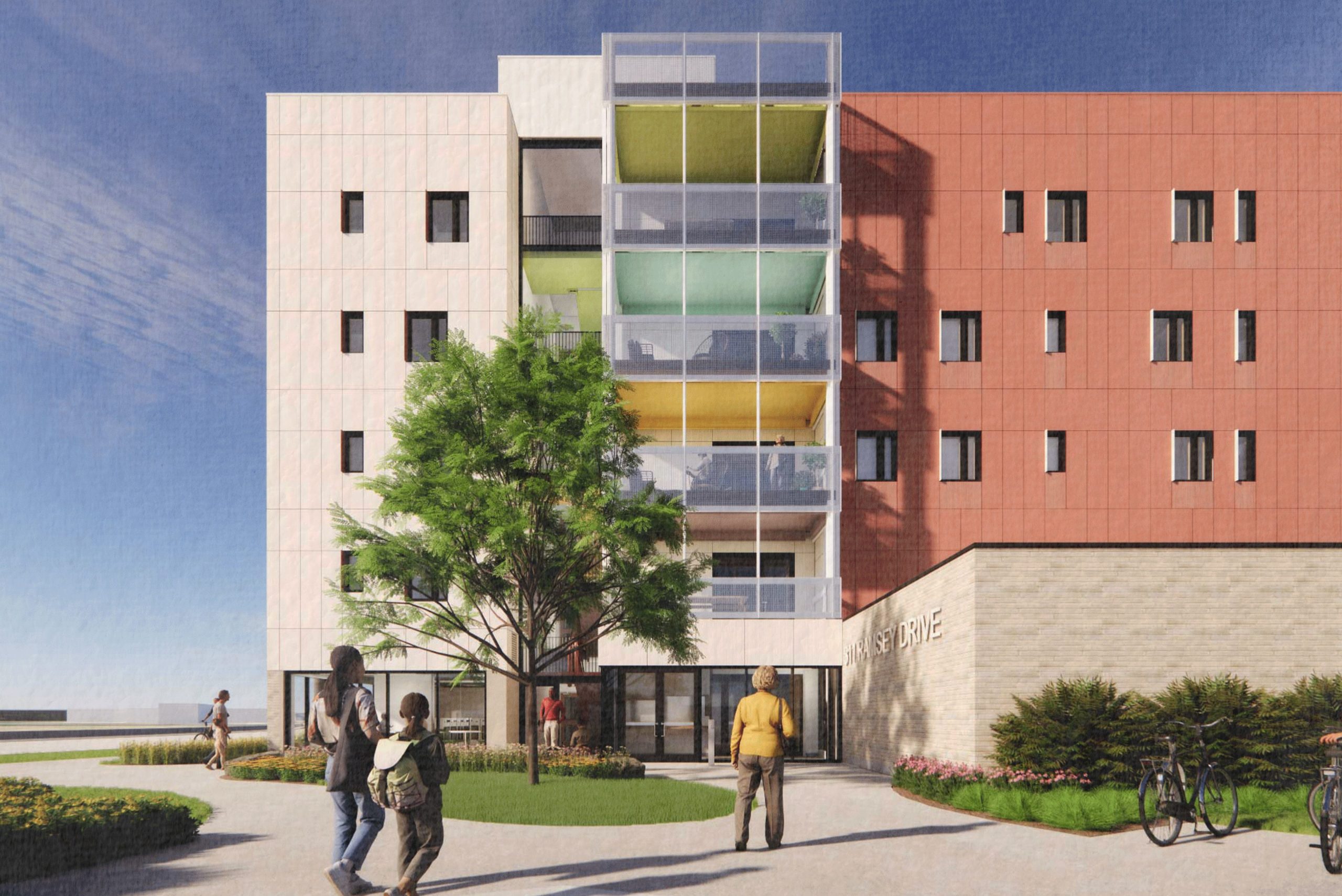 Shared community balconies on each residential floor create opportunities for informal interaction and strengthen residents’ connection to the surrounding neighbourhood.